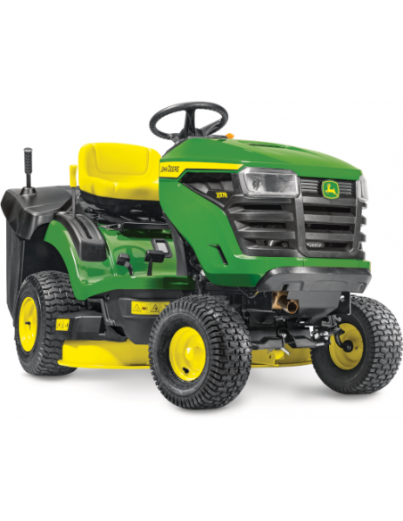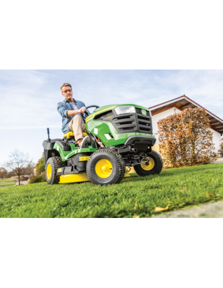 Le tracteur tondeuse X117R avec le carter de coupe de 92 cm est conçu pour les clients exigeants, qui recherchent des produits de haute qualité pour la tonte et le ramassage des feuilles et de l'herbe coupée. Le bac de ramassage (contenance 300L) peut facilement être remplacé par un déflecteur arrière ou par un obturateur mulching, lorsqu'il n'est pas nécessaire de récupérer les déchets. Cette tondeuse autoportée est dotée d'un attelage arrière – grâce à cet outil vous pourrez remorquer un grand nombre d'équipements pour effectuer presque tous les travaux d'entretien du gazon.